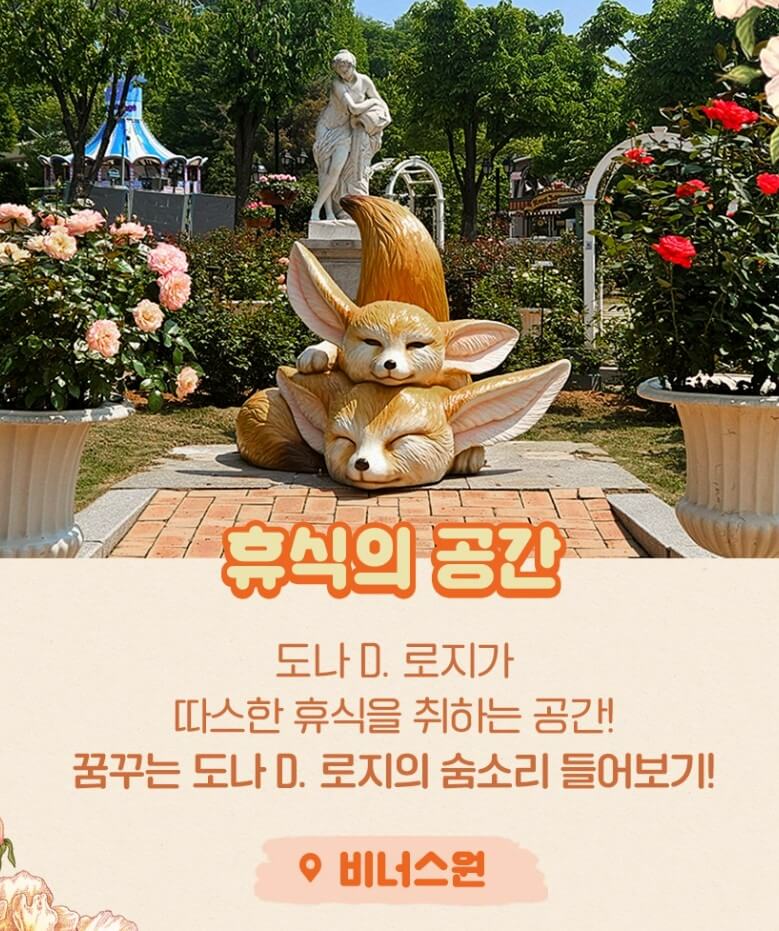 - 포인트: 장미꽃 모양의 장미 광장 + 귀여운 동물들과 앵무새 체험